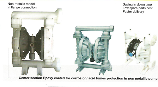 AIR OPERATED DOUBLE DIAPHRAGM PUMP APPLICABLE INDUSTRIES Automotive Industry Cosmetics Paints & Coatings Shipbuilding Beverage Industry Food Pharmaceutical Industry Textile & Carpet Ceramics Furniture Industry Plating Water and Sewage Treatment Chemical Industry Mining Refineries Utility Construction Industry Municipalities Road Tanker Truck Petrol / Gas Stations SALIENT FEATURES No seal, No leakage No motor, No fire. Explosion proof No rotation, No charging, less wear and tear. Self priming, No foot valve needed. Pump can run dry without damage Variable flow, with same pump Stop automatic on closing of discharge valve.. Can be submerged. Light weight, handy in use. Can handle solids 2mm to 10 mm. Less stock of spare parts to be maintained. No skilled person is needed to operater or repair pump Also can be used as metering pump up to accuracy of 3 - 5% In short a very simple and versatile pump. SPECIFICATIONS This Parameters depend on size of pump Temperature Max 90°C Solid Size Max 10 MM Solid % Max 50% Viscosity 15000 CP Self Priming 6Mtr of water column Model Inlet air connection in inches Inlet in inch Outlet in inch Max Flow in LPM Max Solid Size in MM Material of casing AIRON15 1/4" 1/2 1/2 33 2.5 PP, SS, PVDF, AL AIRON25 1/4" 1 1 60 3.4 PP, SS, AL, PVDF AIRON40 1/2" 1.5 1.5 140 5.0 PP, SS, AL, AIRON50 3/4" 2 2 300 6.5 PP, SS, AL AIRON80 1" 3 3 440 10.0 ALUMINUM