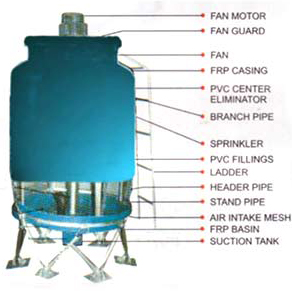INDUCED DRAFT COOLING TOWER MANUFACTURER IN COIMBATORE Cooling water returns in a warm state from the process and enters at the top of the cooling tower under pressure to be distributed through the fill pack. Simultaneously, air is drawn in at the base of the tower by the fan and travels upward to mix with the water where some evaporation takes place, removing heat from the remainder. The warm moist air is discharged to atmosphere. Features Cooling capacities from 50kW to 12, 000kW. Body and basin constructed from Z725 galvanized steel. High performance, long life axial fan. Vertical air discharge at a sufficient distance from the horizontal air intake to prevent air re-circulation. Highly efficient drift eliminator limiting water losses to less than 0.001% of the water re-circulation rate. Patented fill pack inducing a highly turbulent mixing of air and water for superior heat transfer. Superior two pass air intake louver and screen design to minimise water splash out and block sunlight to reduce algae formation. The low pressure drop design results in lower fan energy consumption and operating costs. Pressurized water distribution system with sediment preventing sludge rings incorporated within the spray nozzles. Easily removed for maintenance. A.C.O.P L8-2000 compliant.