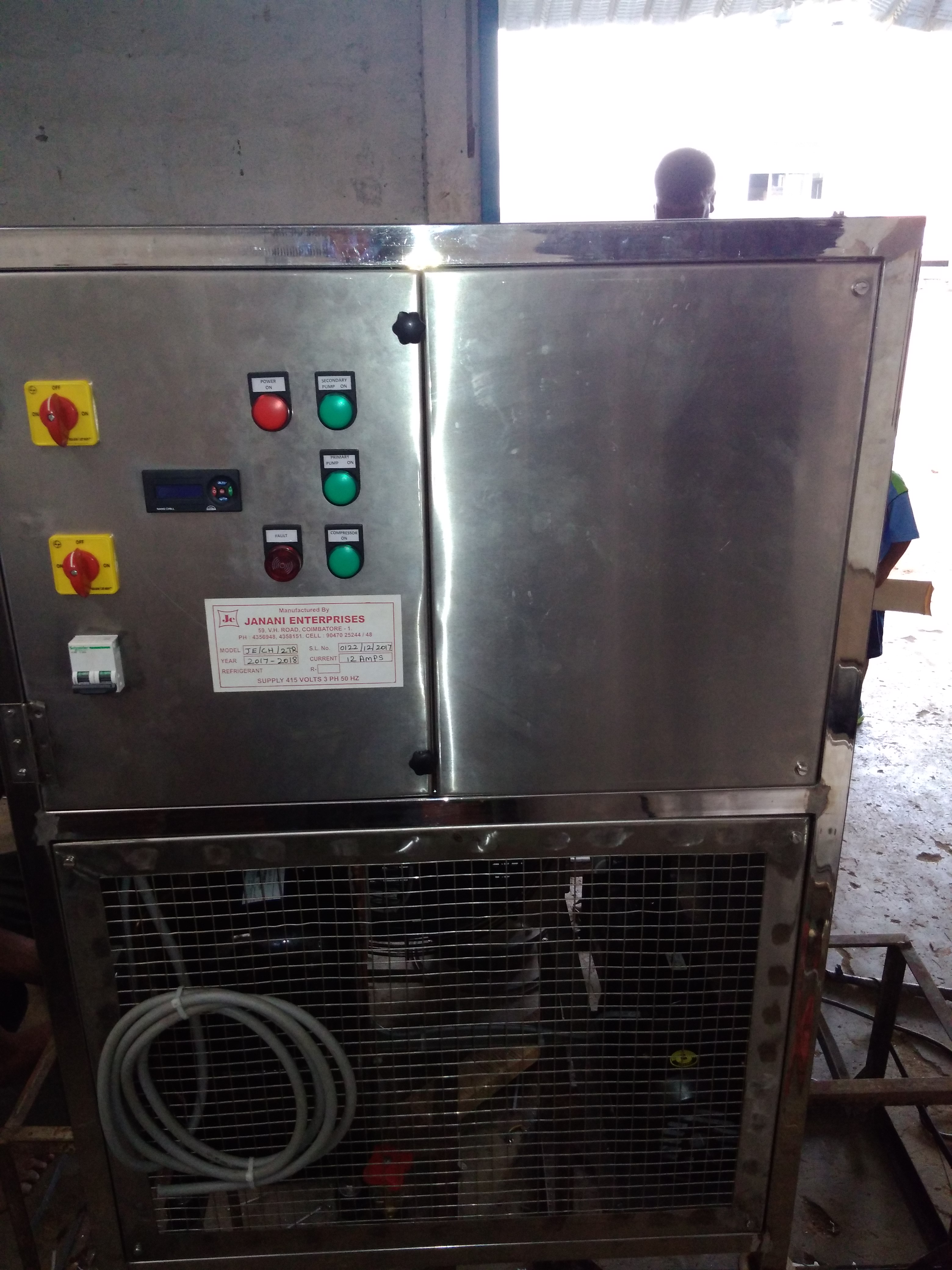 Leading 5TR Air-Cooled Water Chiller Manufactures in Chennai and Kerala. Air cooled chillers absorb heat from process water, and the heat is then transferred to the air around the chiller unit. This type of chiller system is generally used in applications where the additional heat it discharges is not a factor. In fact, it's often practical to use the excess heat to warm a plant during the winter, thus providing additional cost savings Air cooled chillers require less maintenance than water-cooled units.Air cooled chillers do not require a cooling tower or a condenser water pump.Consume approximately 10% more power than a water-cooled unit due to wet surfaces transferring heat better than dry surfaces.