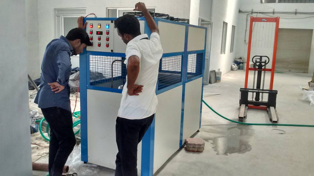 Leading 7.5TR Air-Cooled Water Chiller Manufactures in Bangalore and Coimbatore. SPECIFICATIONS (7.5TR) 1. SYSTEM : INDUSTRIAL PROCESS CHILLER 2. MODEL NO. : JE-07.5-AWC 3. FLOW RATE : 500LPH 4. INLET TEMPERATURE TO CHILLER : 160C 5. OUTLET TEMPERATURE FROM CHILLER : 90C 6. REFRIGERATION LOAD : 7.5 TR 7. COOLING WATER REQUIREMENT : N.A 8. CHILLER TYPE : PHE 9. CONDENSOR TYPE : FINNED TUBE TYPE 10. REFRIGERANT : R404A OR 134A 11. REFRIGERATION COMPRESSOR : SCROLL TYPE 12. POWER CONSUMPTION* : 8.25 KW 13. CONTROL : FULLY AUTOMATIC 14. SAFETY INTERLOCKS 1. L P SWITCH 2. H P SWITCH 3. COMPRESSOR AND PUMP OVERLOAD TRIP 4. DIGITAL TEMPERATURE CONTROL B. COMPRESSOR 1. MAKE Emerson Copeland / Danfoss 2. TYPE SCROLL 3. COMPRESSOR MODEL NON STANDARD •