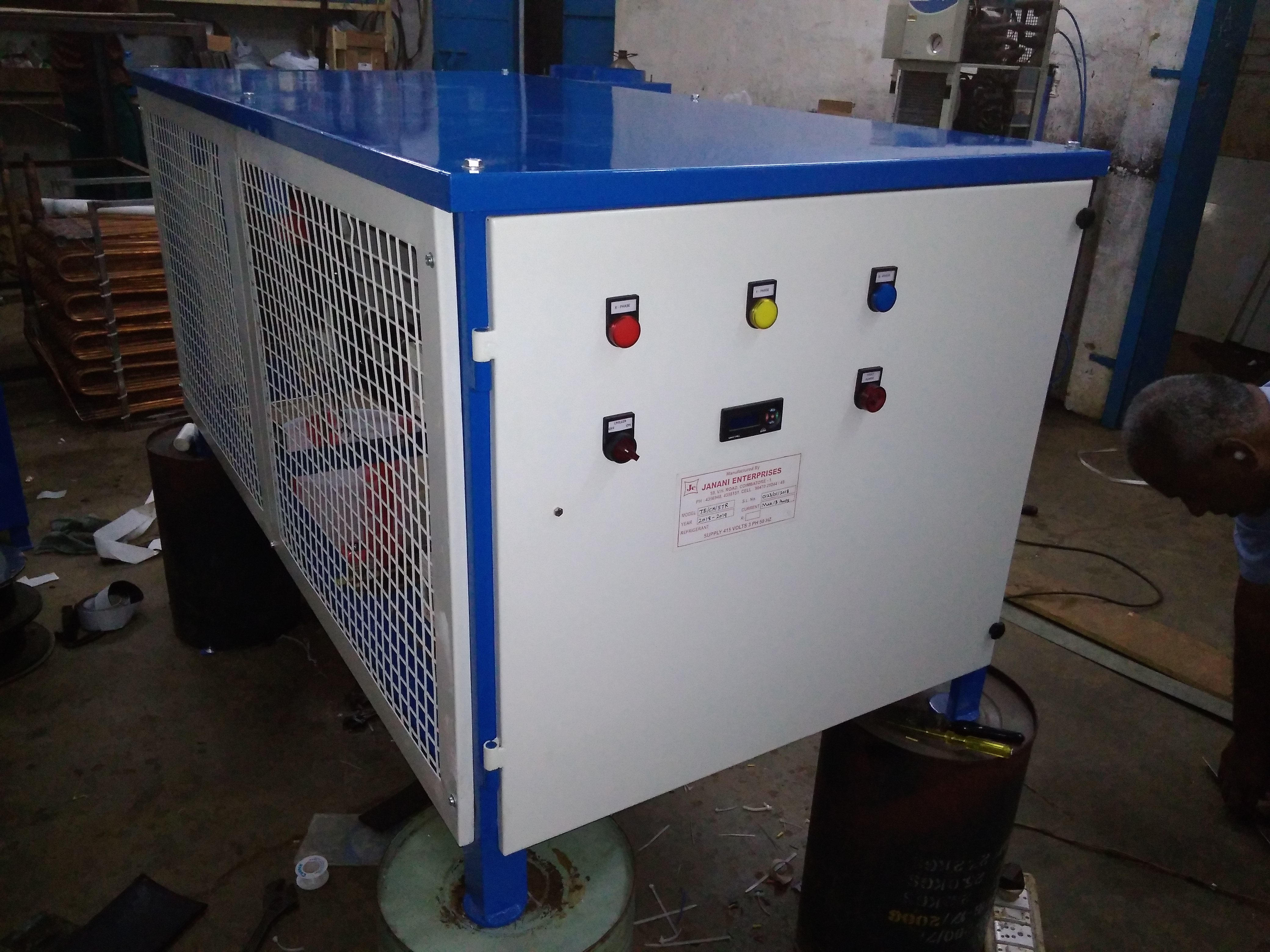 Leading Air-Cooled Water Chiller Manufactures in Coimbatore and Kerala. Product details: Capacity 1 TR to 10 TR Automatic Grade Automatic Temperature 10 degreeC to 30 degreeC Compressor Sealed, Semi-Sealed Chiller Shape Shell, Tube Product description: Being a well-established organization, we are presenting a wide range of Water Chiller. This air cooled chiller has a fully automatic operation and is made with plate type evaporators. Offered air cooled chiller is quality tested by our experts in order to guaranty its flawless range. Our air cooled chiller is developed from the supreme class components and modern technology following the industrial norms. Customers can choose any of the series to get the best air chiller cooling solution. Features: Rugged construction Dual compressors for power saving User-friendly microprocessor based control panel Other Details: High-quality components and robust design Factory built and tested for quality check Single, dual compressors for power saving User-friendly microprocessor based control panel CFC free, environmentally friendly refrigeration system Chillers are fully automatic with high-quality controls Quick chilling is ensured with plate type and shell and tube evaporators Sealed, semi-sealed compressor Air-cooled force draft condenser Plate heat exchanger, coil-in-tank, shell & tube chillers
