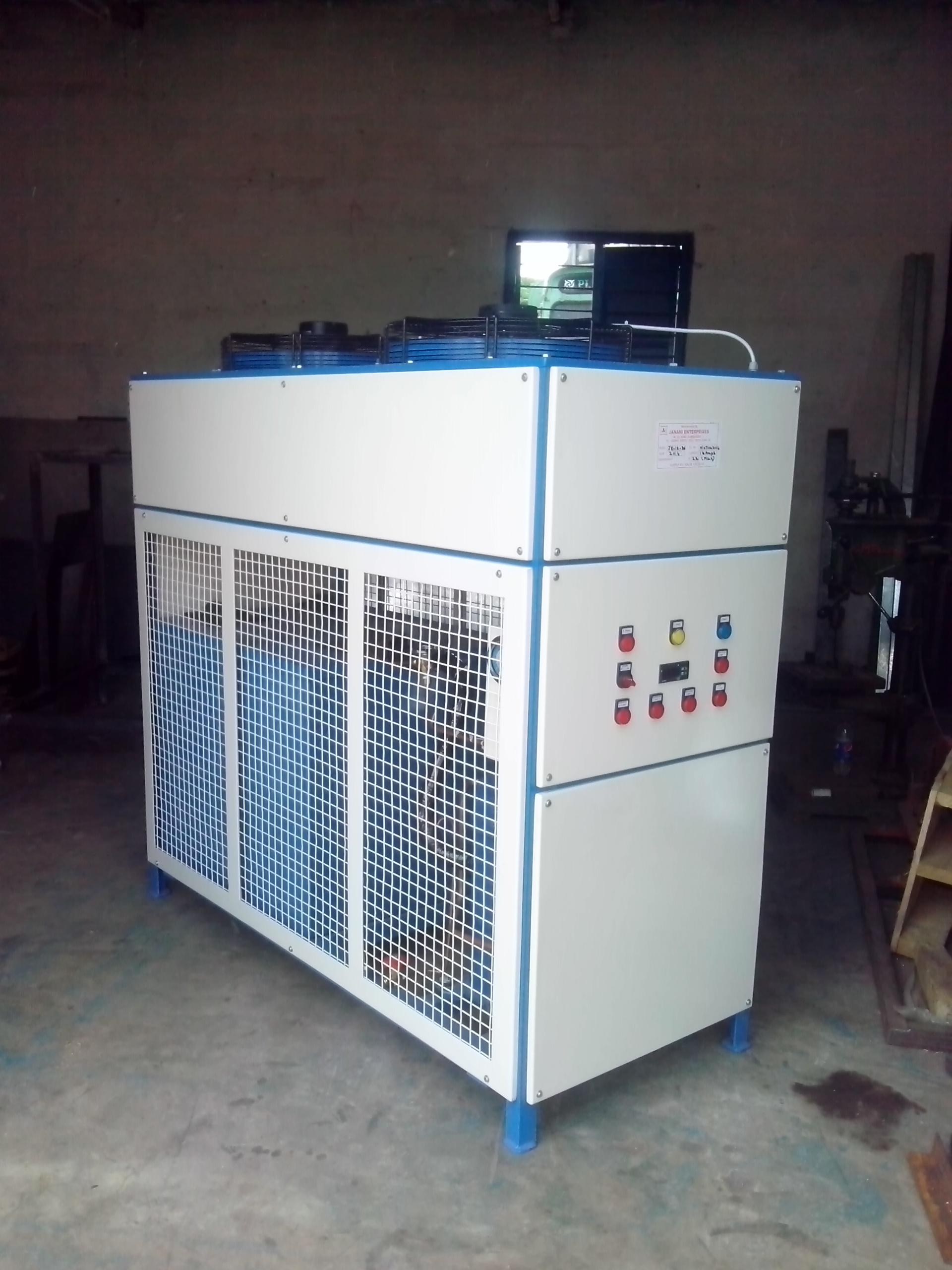 Leading Air-Cooled Water Chiller Manufactures in Mysore and Coimbatore. TECHNICAL SPECIFICATIONS (3TR) 1. SYSTEM : INDUSTRIAL PROCESS CHILLER 2. MODEL NO. : JE-03-AWC 3. FLOW RATE : 260 LPH 4. INLET TEMPERATURE FROM CHILLER : 35 0C 5. OUTLET TEMPERATURE TO CHILLER : 1 0C 6. REFRIGERATION LOAD : 3TR 7. COOLING WATER REQUIREMENT : N.A 8. CHILLER TYPE : TANK IN COIL /PHE 9. CONDENSER TYPE : FINNED TUBE TYPE 10. REFRIGERANT : R304A / R404A 11. REFRIGERATION COMPRESSOR : SCROLL 12. POWER CONSUMPTION* : 16KW 13. CONTROL : FULLY AUTOMATIC 14. SAFETY INTERLOCKS 1. L P SWITCH 2. H P SWITCH 3. COMPRESSOR AND PUMP OVERLOAD TRIP 4. DIGITAL TEMPERATURE CONTROL B. COMPRESSOR 1. MAKE Emerson Copeland / Danfoss 2. TYPE SCROLL